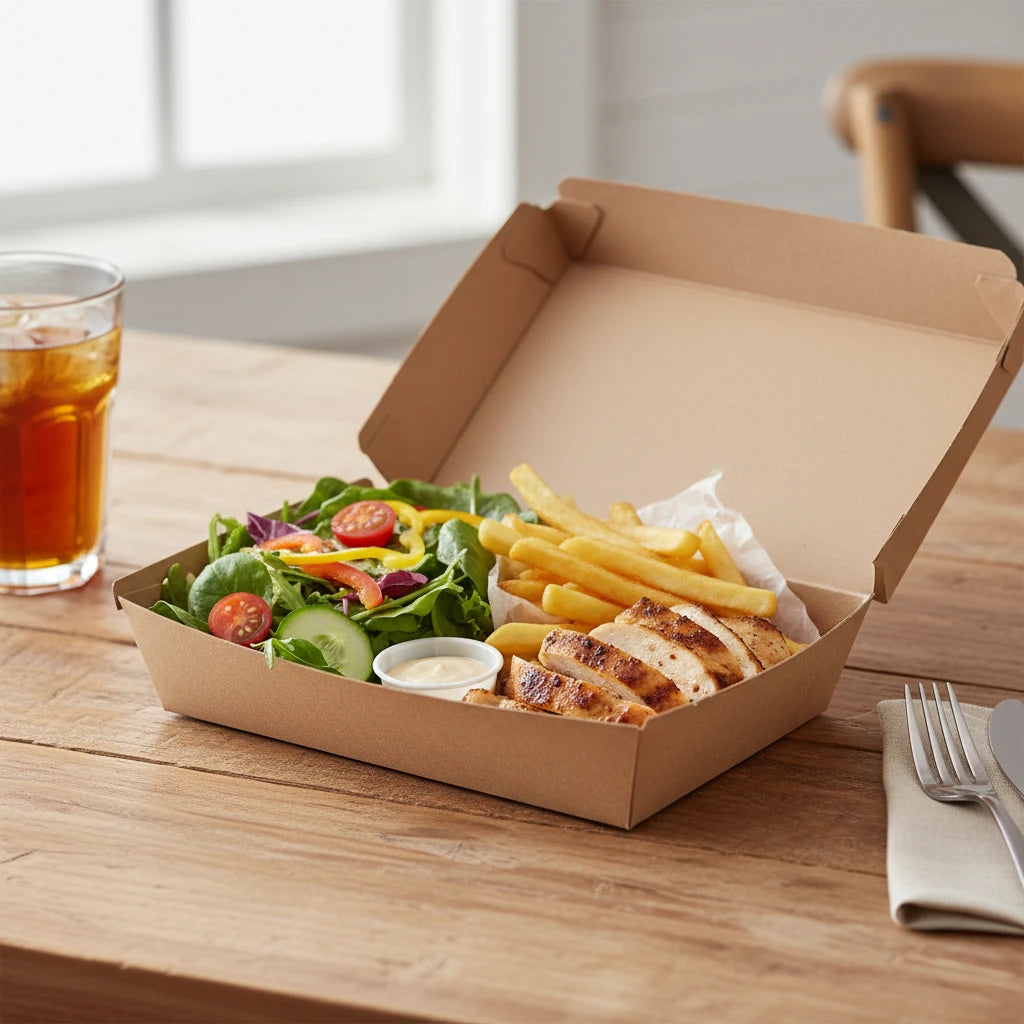 A larger, sturdy compostable kraft snack box designed for generous snack portions, shared sides and takeaway food.