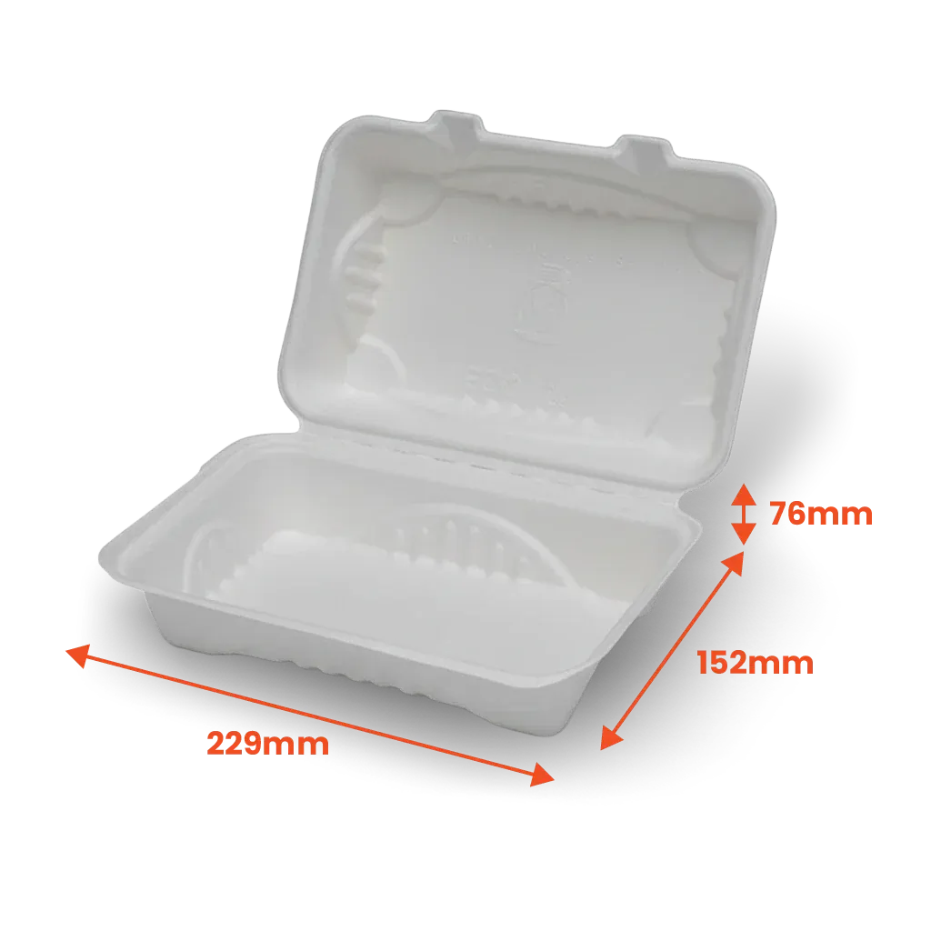A compact sugarcane takeaway clamshell container ideal for burgers, snacks and smaller takeaway meals.
